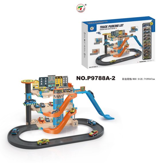 Duży, solidnie wykonany parking samochodowy z dziesięcioma aluminiowymi pojazdami i helikopterem w zestawie, to propozycja dla dzieci od trzeciego roku życia. Parking składa się z 4 poziomów. Na górnym poziomie znajduje się lotnisko dla helikoptera. Niżej mamy miejsca postojowe i zjazd dla samochodzików zjeżdżalnią na sam dół. Na drugim piętrze umiejscowiono miejsca parkingowe i zjazd na najniższy poziom. Na dole znajduje się myjnia, stacja benzynowa oraz ruchoma platforma konserwacyjna . Na każdy z poziomów możemy się dostać za pomocą windy- podnośnika. Winda nie wymaga użycia baterii, sterujemy nią ręcznie. Funkcje parkingu: - winda - podnośnik jeżdżący góra, dół, - ruchoma platforma konserwacyjna samochodu, -myjnia samochodowa, - stacja benzynowa, - zjeżdżalnie dla autek, - miejsca postojowe