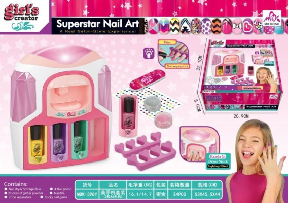 Zestaw do malowania paznokci z interaktywną suszarką do paznokci to propozycja dla dzieci od 6 - go roku życia. Suszarka zasilana jest bateriami typu 3 x AA 1,5 V, baterii brak w zestawie. Po włączeniu wydaje odgłos suszenia i posiada delikatny nawiew. Na górze suszarki świeci się podczas suszenia światełko. Suszarka ma w przedniej części wyjmowane przegródki, a w nich mieszczą się lakiery do paznokci. Lakiery do paznokci wykonane są z bezpiecznych dla dzieci materiałów, nie są toksyczne i łatwo je zmyć ciepłą wodą. Po bokach suszarki znają się skrytki na akcesoria.