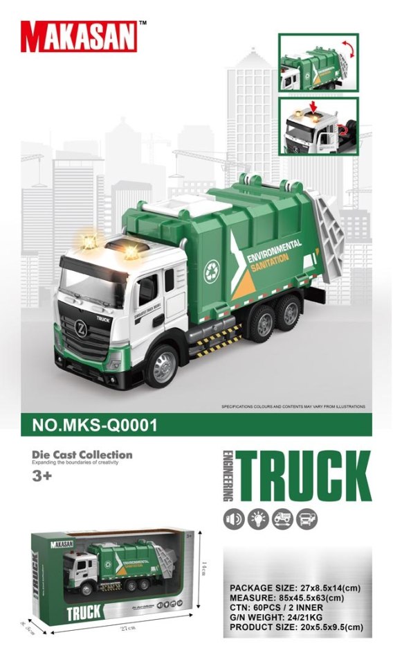 Interaktywna metalowa śmieciarka z funkcją dźwięku i światła dla dzieci od trzeciego roku życia. Śmieciarka wykonana została z metalu i tworzywa sztucznego najlepszej jakości. Pozsiada realistyczne wykonanie. Drzwi kabiny pojazdu się otwierają, a kółeczka łatwo przemieszczają po podłożu. Na dachu kabiny świecą się dwa światełka i słychać odgłos pracy pojazdu i melodie, a klapę wsypu możemy otwierać manualnie. Zabawka zasilana jest bateriami typu 3 x AG13 (w zestawie).