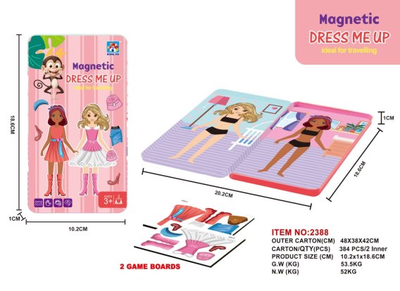 Magnetyczny zestaw stylistki/stylisty dla dzieci powyżej trzeciego roku życia. Zestaw składa się z 13 magnetycznych elementów ubioru. Modelki znajdujące się na wewnętrznych stronach wieczka pudełka można ubierać według własnego upodobania. Zestaw rozwija kreatywność, zdolności manualne i wyobraźnię. Zestaw jest wykonany w całości z magnetycznych elementów, dla tego może być używany wszędzie, bez obawy o zagubienie elementów.