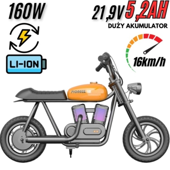 Motocykl elektrycznyHYPER GOGO Pioneer 12 Plusłączy oszałamiający styl naked bike'a, hipnotyzującą gamę kolorowych świateł, realistyczny efekt dymu i porywający ryk silnika. Dzięki temu zapewnia dzieciom wyjątkową radość i zabawę na świeżym powietrzu. Niech dziecko poznaje świat wzdłuż i wszerz, ciesząc się każdą chwilą jazdy!