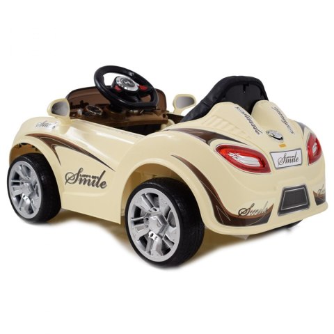 AUTO ROADSTER SMILE zasilane na 12 V z napędem na dwa koła oraz uruchamianie za pomocą kluczyka Dzięki zastosowanym najmocniejszym silnikom 45 W, auto jeździ po nierównym terenie bez żadnych problemów, a dodatkowo silniki te są bardzo dobrej jakości. Atrakcją są amortyzowane miękkie koła dzięki właśnie nim młody kierowca może poczuć komfort jazdy