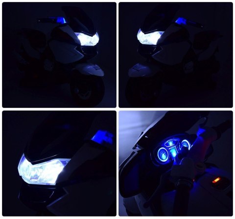 Odpalanie za pomocą kluczyka, dźwięki jazdy motoru, światła, miękkie siedzenie, miękkie koła, gaz w manetce, nożny hamulec,nowoczesny panel, podnóżki, boczne demontowalne kółka