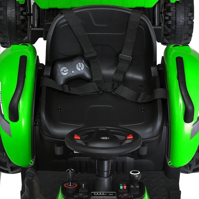 Przyczepę można w każdej chwili odczepić i poruszać się samym traktorem. Panel z wejściem na USB i bluetothem oraz wskażnikiem naładowania pojazdu pojazdu umili i urazmaici zabawą. Pojazd posiada dźwignię zmiany kierunku jazdy.