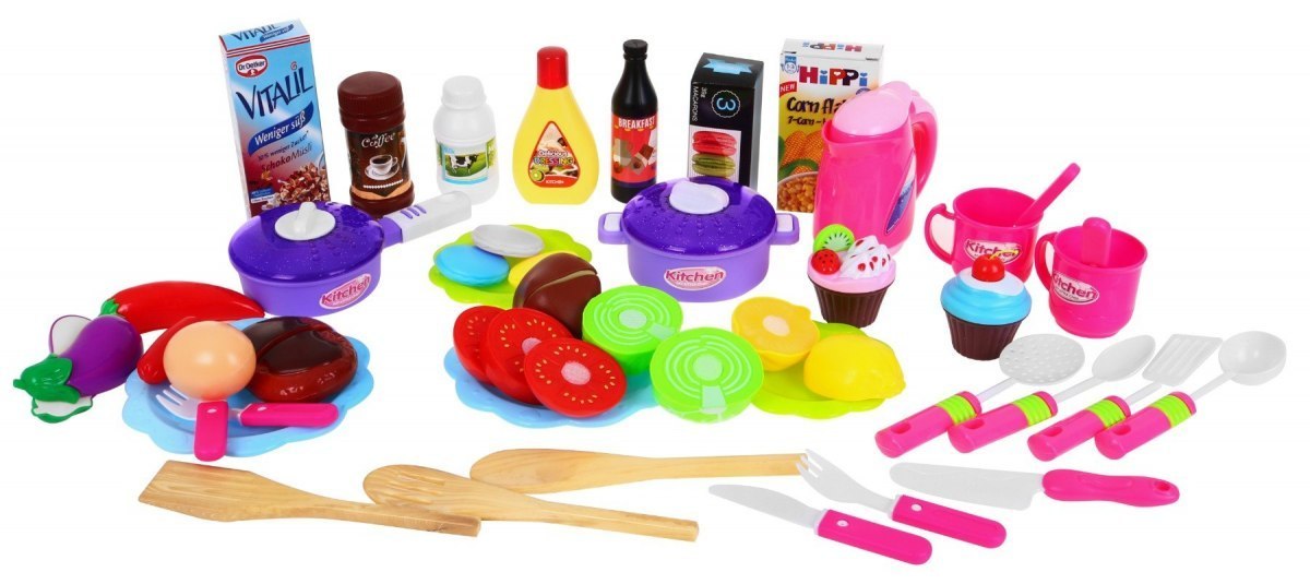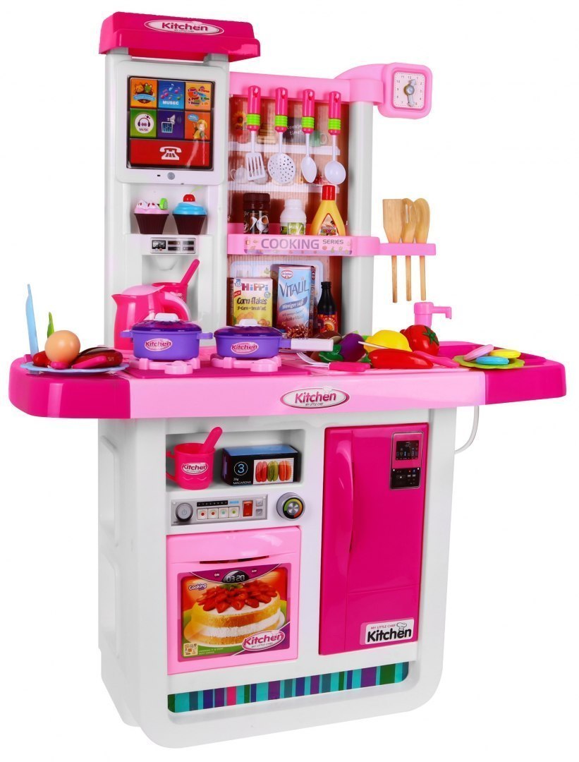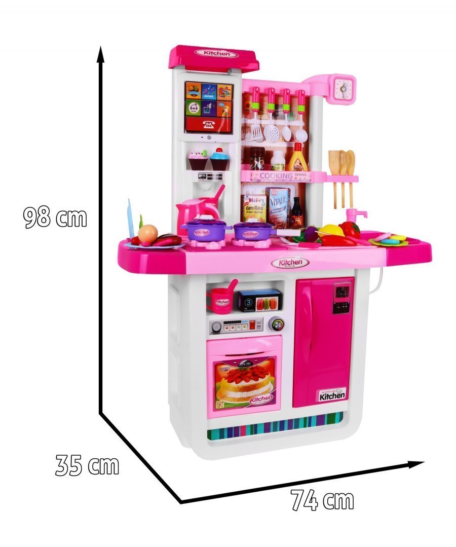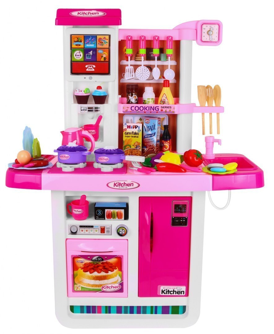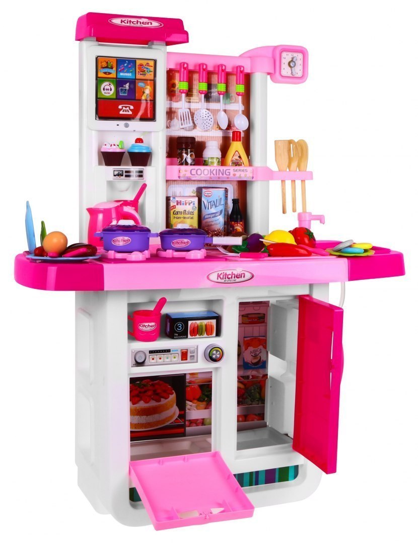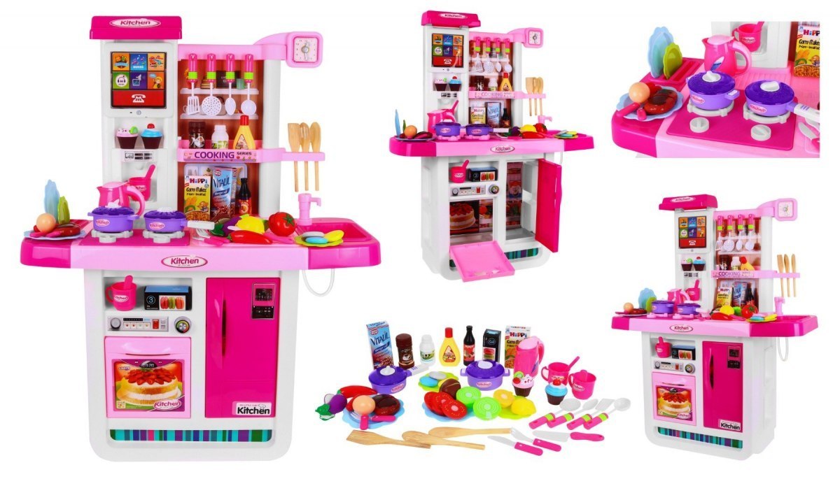 Kuchnia posiada otwierany piekarnik i lodówkę, 2 palniki z dźwiękami i światłami oraz zlew z kranem z którego leci prawdziwa woda.