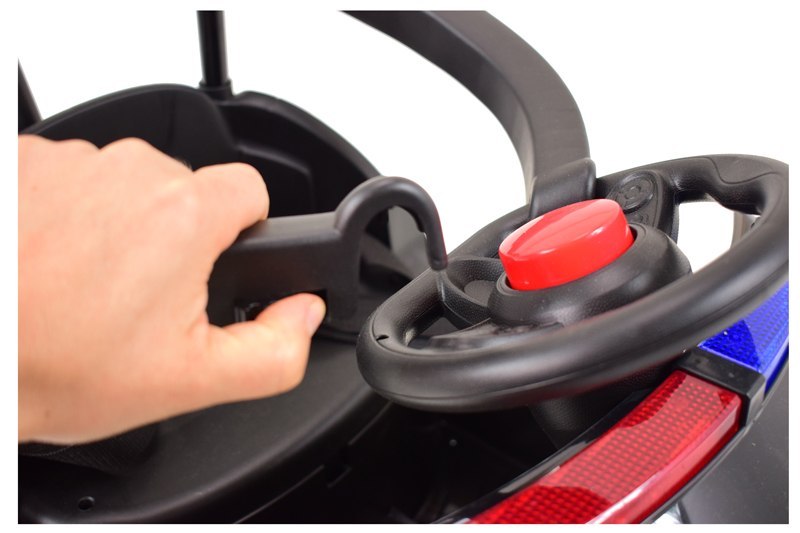 Samochód wyposażony jest w wygodne siedzenie z pasami i barierkami oraz dźwięki policyjne i świecący świecący kogut policyjny. Barierki można w łatwy sposób odpinać lub zdemontować.