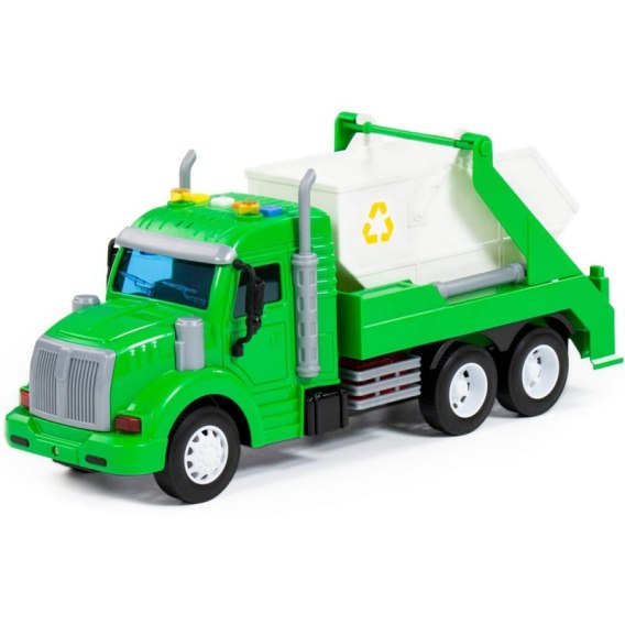 Ciężarówka z serii Profi od firmyPolesie, cenionego producenta zabawek dla dzieci, jest idealną zabawką dla naszej pociechy. Ciężarówka służy do przewozu kontenerów.Jeden z nich został dołączony do zestawu. Pojazd posiada opcję włączenia świateł które ma zamontowane na górze jak i tych do jazdy dziennej, dodatkowo po wciśnięciu odpowiedniego przycisku ciężarówka wydaje realistyczne dźwięki. Pojazd w bardzo ładnym stonowanym zielonym kolorze z białym kontenerem.