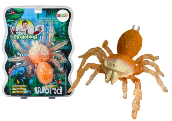 Rozciągliwy pająk w kolorze pomarańczowym ma gumowe, elastyczne odnóża i plastikowy tułów. To świetna zabawka do zabawy i ciekawa ozdoba do pokoju, idealna dla miłośników nietypowych gadżetów i oryginalnych dekoracji.