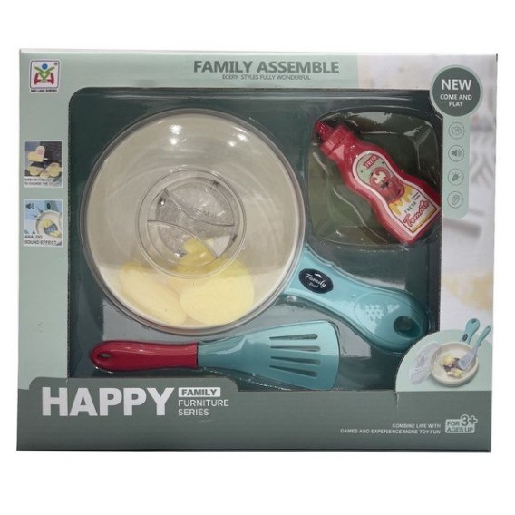 Interaktywna patelnia z funkcją dźwięku i światła dla dzieci od 3-go roku życia. W zestawie znaleźć możemy patelnię z pokrywką, łopatkę, talerzyk, ketchup, rybkę, kiełbaski oraz stek. Patelnia zasilana jest bateriami typu 2 x AAA 1,5 V (brak w zestawie). Po założeniu baterii i włączeniu zabawki słychać odgłosy smażenia i świecą się w środku patelni. 3 diody, które odpowiedzialne są za podgrzewanie produktów, a dzięki temu, produkty zmieniają kolor i wyglądają na upieczone.
