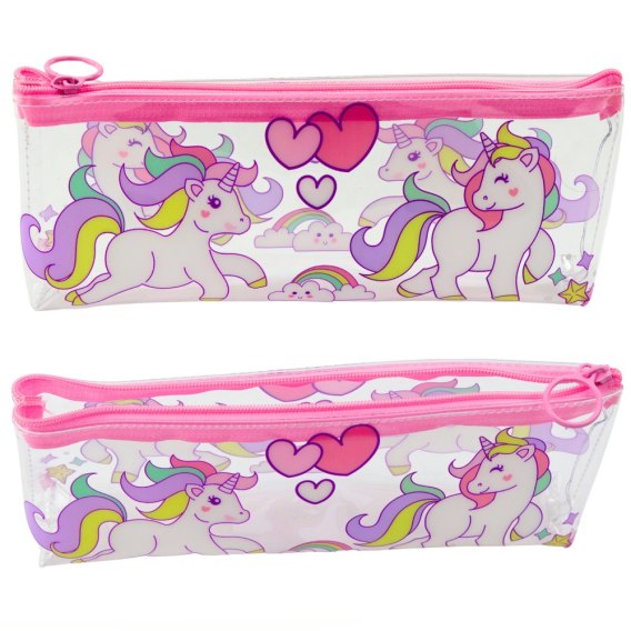 Uroczy piórnik dziewczęcy z motywem jednorożców to idealny dodatek do szkolnej wyprawki każdej małej księżniczki. Transparentna obudowa z kolorowymi jednorożcami, serduszkami i gwiazdkami sprawia, że piórnik przyciąga wzrok.