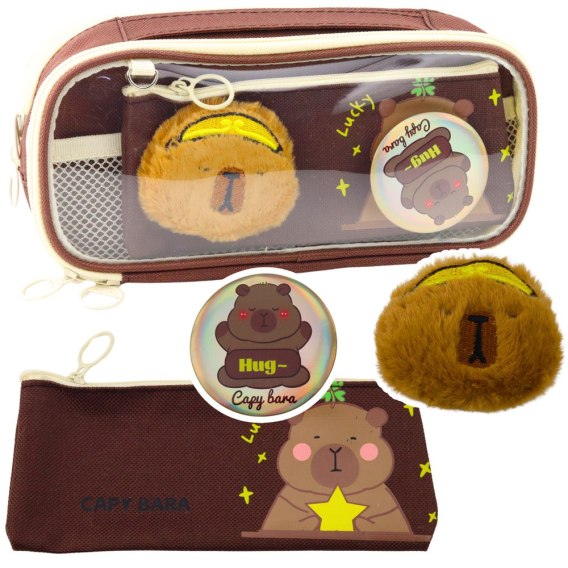 Piórnik Szkolny Kapibara Pluszowa Dodatkowa Saszetka Przypinka Brązowy 23cm
