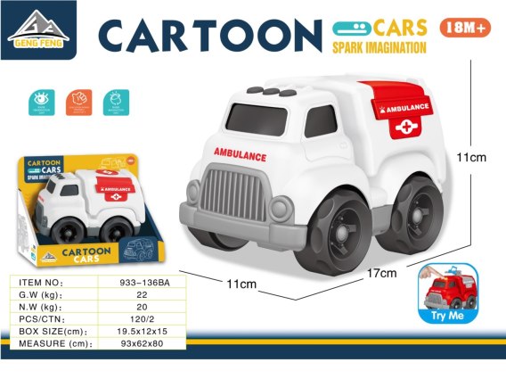 Interaktywny ambulans dla dzieci od osiemnastego miesiąca życia. Zabawka wykonana została z najlepszej jakości materiałów i nie posiada żadnych ostrych krawędzi. Na dachu karetki znajdują się przyciski dźwiękowe i świetlne, po naciśnięciu, na które słychać odgłosy, odpalania pojazdu, jazy, cofania oraz wesołą melodię. Mrugają także światełka na dachu. Zabawka zasilana jest bateriami typu 4 x LR44 (w zestawie).