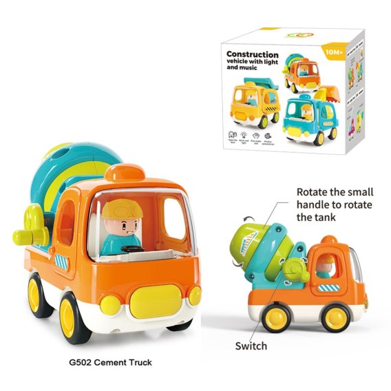 Interaktywna betoniarka z funkcją dźwięku i światła dla dzieci od dziesiątego miesiąca życia. Zabawka wykonana została trwałego i bezpiecznego tworzywa sztucznego, nie posiada ostrych krawędzi, wytrzyma najbardziej energiczną zabawę. Żywe kolory przyciągają wzrok dziecka i zachęcają do zabawy. Efekty dźwiękowe i świetlne stymulują zmysły maluszka i dodają realizmu zabawie. Kółeczka z łatwością przesuwają się po podłożu, a drzwi i gruszka pojazdu jest ruchoma. Zabawka zasilana jest bateriami typu 3 x AG13 (w zestawie).
