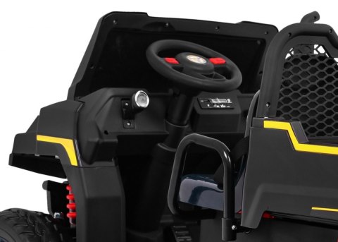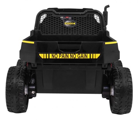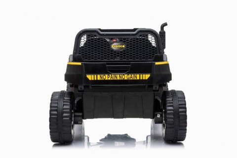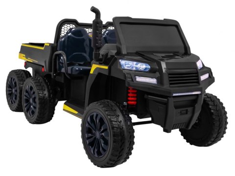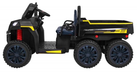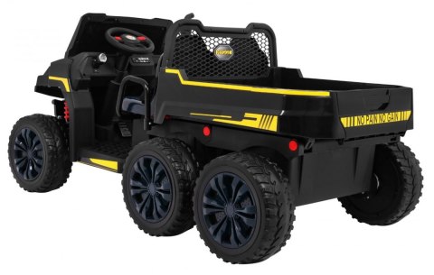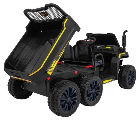 Posiada aż 6 kół - w tym 4 napędzane, wykonane z pianki EVA - nie szumią, nie rysują podłoża, są ciche i wytrzymałe. Fantastyczne wyposażenie AUDIO: wgrana muzyka, wejście USB, bluetooth, klakson. Mocnym atutem pojazdu jest uchwyt do holowania w razie rozładowania akumulatora. Na tylnej burcie istnieje możliwość przewożenia różnego rodzaju zabawek, piasku, patyków, liści itp. Dodatkowo wdrożono możliwość kiprowania zawartości burty. Pojazdem można sterować na dwa sposoby: