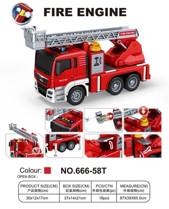 Interaktywna straż pożarna z funkcją wody dla dzieci od 3-go roku życia. Straż wykonana została z najlepszej jakości plastiku w żywych kolorach. Posiada gumowe opony, dobrze trzymające się podłoża oraz napęd Friction. Na górze auta strażackiego znajdują się przyciski odpowiedzialne za generowanie dźwięków syren, odgłosów odpalania pojazdu oraz pracy silnika. Po bokach przycisków dźwiękowych są też świecące światełka. Drabinę wozu strażackiego możemy podnosić i opuszczać oraz wysuwać do przodu (manualnie). Po napełnieniu zbiorniczka znajdującego się przy kabinie pojazdu wodą i naciśnięciu pompki z węża będzie wydobywać się woda. Zabawka zasilana jest bateriami typu 3 x AG13 (w zestawie).