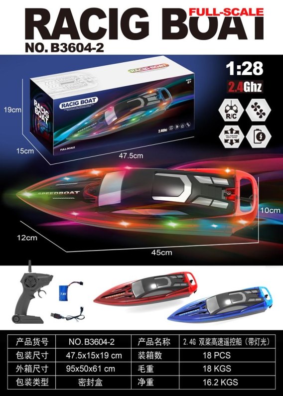 Zdalnie sterowana, szybka łódź wyścigowa z oświetleniem dla dzieci od ósmego roku życia i starszych. Łódź została wykonana z najwyższej jakości wytrzymałych materiałów. Jakość materiałów i opływowy kształt pozwalają na szybkie poruszanie się w wodzie. Oświetlenie LED, sprawia, że łódź jest bardziej widoczna i świetnie się prezentuje szczególnie po zmroku. Motorówka płynie do przodu i do tyłu, a także skręca w lewo i prawo. Zabawkę wyposażono w czujnik, dzięki któremu uruchamia się dopiero w wodzie. Zasilanie akumulatorem 7,4 V12000 mAh  (w zestawie), pilot bateriami 2 x AA 1,5V (brak w zestawie). W zestawie znajduje się stojak na łódź.