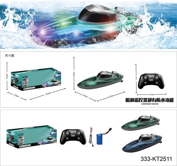 Zdalnie sterowana łódź z podświetleniem dla dzieci od trzeciego roku życia. Łódź wykonano z wytrzymałego tworzywa ABS, co zapewnia jej długą żywotność, zasilana jest akumulatorem typu 7,4 V, co zapewnia jej ok. 20 minut działania, ładowanie to ok. 3 godziny. Pilot jest wodoodporny i zasilany bateriami typu 2 x AA 1,5 V (brak w zestawie). Łódź zaczyna działać po włożeniu jej do wody, może płynąć we wszystkich kierunkach i wykonywać obroty o 360 stopni. Zasięg zdalnej kontroli to aż 30 m. Łódź posiada podświetlenie, co zwiększa jej widoczność i daje niesamowite efekty świetlne na wodzie.