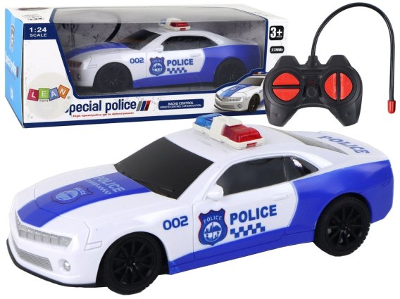 Zdalnie sterowane autko policyjne z efektami świetlnymi. Gumowe koła, skala 1:24, zabawa w pościgi w domu i na zewnątrz. Dla małych miłośników akcji.