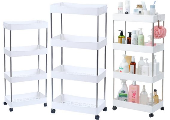 Praktyczny regał mobilny na kółkach, idealny do kuchni, salonu, sypialni czy łazienki. Wykonany z wysokiej jakości materiałów, zapewnia 4 przestronne półki na przyprawy, kosmetyki i książki. Łatwy montaż, elegancki wygląd i mobilność! Wymiary: 34,5 x 12 x