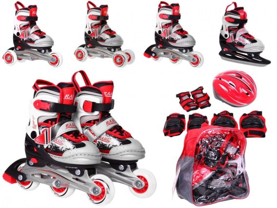 Zmienny zestaw 4w1 w plecaku z 4 stopniową regulacją rozmiaru: wrotki, wrotko-rolki, rolki, łyżwy.