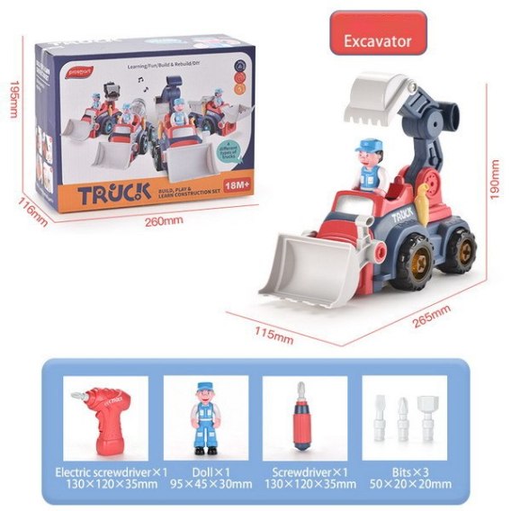 Kolorowa, interaktywna, rozkręcana koparka, dla dzieci od 18-go miesiąca życia. Zabawka wykonana została z bezpiecznych dla dziecka materiałów, wysokiej jakości, w żywej kolorystyce. Pojazd można rozkręcać i skręcać dowolną ilość razy. Posiada efekty dźwiękowe, po włączenia słychać wesołą melodię oraz posiada efekty świetlne w postaci mrugających światełek na kółkach. Koparka jeździ we wszystkich kierunkach, a po napotkaniu przeszkody omija ją. Górną oraz dolną łyżką pojazdu możemy manualnie poruszać. Dodatkowo ramię koparki jest ruchome o 360 stopni. Po włączeniu koparki tylne ramię koparki porusza się delikatnie w prawo i w lewo. W zestawie znajdują się akcesoria takie jak figurka operatora koparki, wiertarko-wkrętarka, śrubokręt, wymienne bity do wkrętarki lub śrubokręta. Wkrętarko-wiertarka zasilana jest bateriami typu 2 x AAA (brak w zestawie), koparka bateriami typu 3 x AAA (brak w zestawie).