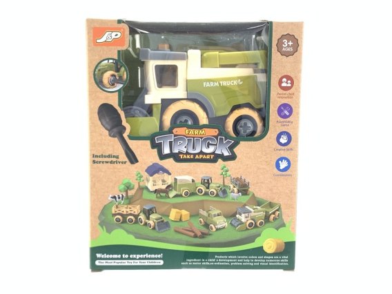 Rozkręcany kombajn dla miłośników maszyn rolniczych ze śrubokrętem i akcesoriami to propozycja dla dzieci od 3-go roku życia. W zestawie znajduje się kombajn, który dziecko może zdemontować za pomocą śrubokręta i zmontować z powrotem oraz akcesoria takie jak drewienka, zwierzaczki, zagroda. Kombajn posiada ruchome elementy takie jak obrotowy nagarniacz, oraz rura wysypu do ziarna. Z tyłu kombajnu umieszczony jest hak.