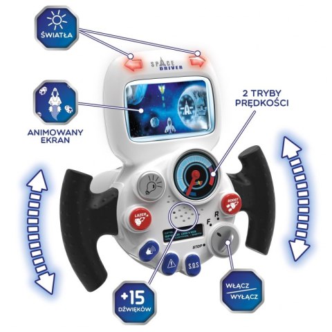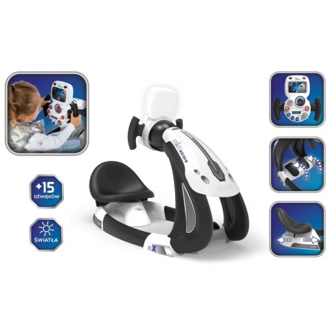 Kosmiczny symulator jazdy to zabawka idealna dla miłośników podróżowania w kosmosie. Dziecko może usiąść wygodnie za kierownicą, położyć nogi na pedałach i wystartować statkiem kosmicznym w podróż.