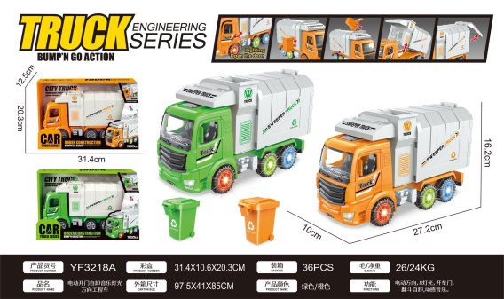 Interaktywna śmieciarka z funkcją dźwięku i światła dla dzieci od trzeciego roku życia. Śmieciarka wykonana została z najlepszej jakości tworzywa sztucznego, z dbałością o szczegóły. Kółeczka pojazdu są podświetlane, a na spodzie znajduje się obrotowe kółeczko umożliwiające jazdę we wszystkich kierunkach. Zabawka wydaje odgłosy jazdy, klaksonu, hamowania i wesołej melodii. Podczas jazdy otwierają się też drzwi ciężarówki, podnosi i opuszcza kontener, świecą przednie światła. Kosz na śmieci dołączono do zestawu, można go zaczepić o bok śmieciarki i kiprować z niego śmieci bezpośrednio do zsypu, ponadto możemy podnosić kontener oraz jego tylną klapę (manualnie). Zabawka zasilana jest bateriami typu 3 x AA 1,5 V (brak w zestawie).
