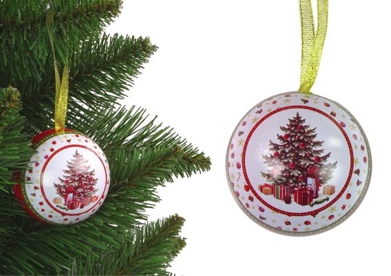 Przedstawiamy bombkę, która może stanowić także opakowanie dla prezentu znajdującego się w środku. Okrągła ozdoba otwierana jest na dwie połówki, a w środku posiadamy pustą przestrzeń, w której możemy schować słodycze bądź biżuterie. Sznureczek zamontowany w niej daje możliwość także zawieszenia na choince.