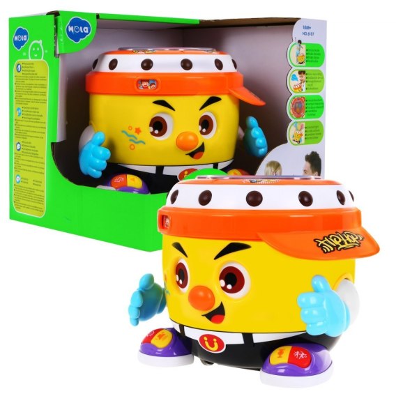 W górnej części bębenka znajduje się panel w który dziecko może uderzać a wydobywać będą się rytmy perkusji i migać światełka.