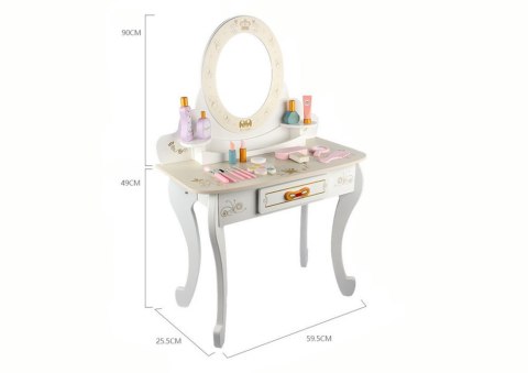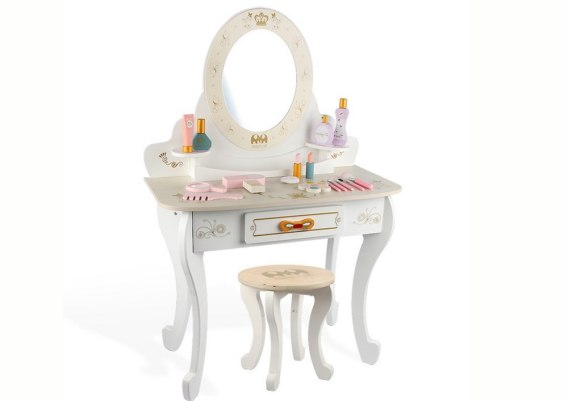 W toaletce zostało zamontowane bezpieczne okrągłe lustro. Posiada wysuwaną szufladę w centralnej części toaletki na biżuterię lub inne skarby. Dziewczynki mogą bawić się w salon urody lub kosmetyczkę. W zestawie znajdują się szczotka, suszarka, perfumy, szminka, lakier do paznokci oraz otwierana atrapa z lusterkiem i cieniami do powiek. Wszystko wykonane jest z drewna. Przy tych pięknych akcesoriach mogą powstać niesamowite fryzury i makijaże.