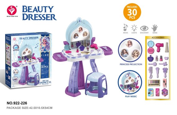Interaktywna toaletka z funkcją dźwięku i światła dla dzieci od trzeciego roku życia. Toaletka wykonana została z najlepszej jakości materiałów, bezpiecznych dla dzieci w żywych kolorach. W zestawie znajduje się aż 37 akcesoriów do pielęgnacji i makijażu. Toaletka posiada oświetlenie dokoła blatu, a na lustrze wyświetlają się rysunki księżniczek. Efektom świetlnym towarzyszą efekty dźwiękowe w postaci wesołych melodii. Zabawka zasilana jest bateriami typu 3 x AA 1,5V (brak w zestawie).