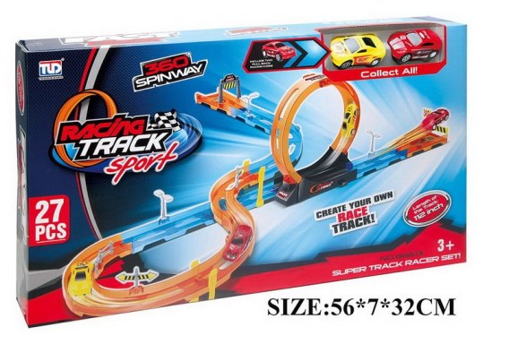 Duży, ekstremalny tor wyścigowy z ostrymi zakrętami, pętlami i dwoma autkami w zestawie, to propozycja dla dzieci od 3-go roku życia. Zestaw składa się z 27 elementów do samodzielnego montażu. Na torze znajdują się odcinki proste, ostre zakręty z barierkami zabezpieczającymi przed wypadaniem pojazdu z trasy, dwa poziomy, a także pętla 360 stopni. Pojazdy dołączone do zestawu posiadają napęd pull back.
