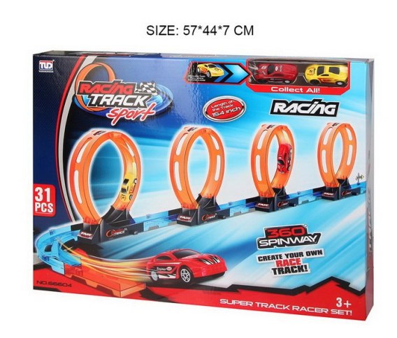 Tor wyścigowy z czterema pętlami 360 stopni, dla dzieci od 3-go roku życia. Tor wykonano z najlepszej jakości plastiku w żywych kolorach. Na zestaw składa się 31 elementów do samodzielnego montażu. Tor posiada odcinki proste do rozpędzenia pojazdu, 4 pętlę 360 stopni i dwa pojazdy. Pojazdy napędzane są napędem pull back. Wystarczy delikatnie nacisnąć pojazd do tyłu, by przejechał tor z pełną mocą.