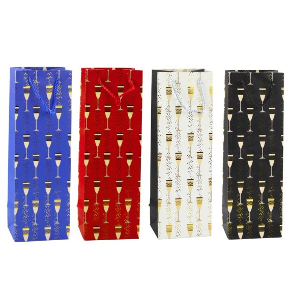 Torebka wyróżnia się efektownym nadrukiem w motyw kieliszków z elementami złotego połysku, który doskonale wpisuje się w klimat uroczystości - wesel, urodzin, rocznic, Sylwestra czy spotkań firmowych. Dostępna w czterech kolorach: niebieskim, czerwonym, białym i czarnym.