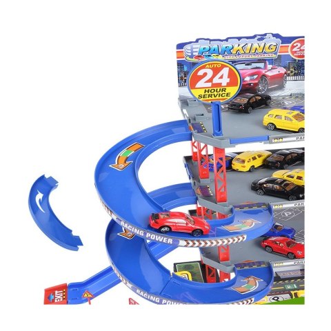 - w zestawie: 4 auta i helikopter, elementy parkingu, znaki drogowe, pachołki, elementy drogi wjazdowej na parking, winda oraz naklejki,