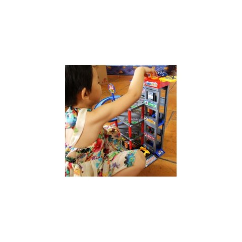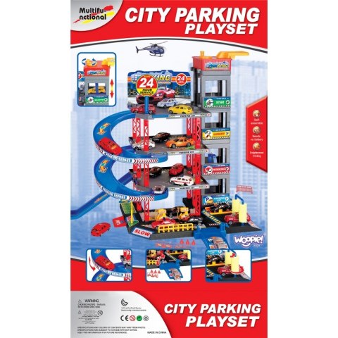 Rewelacyjny wielopoziomowy parking marki WOOPIE ze stacją benzynową, podnośnikiem, windą, myjnią, warsztatem samochodowym oraz lądowiskiem dla helikoptera rozbudzi wyobraźnię każdego fana szybkich samochodów oraz motoryzacji. Aby pojazd mógł dostać się na parking należy podnieść rampę. Dzięki windzie (która porusza się ręcznie) pojazdy mogą przemieszczać się pomiędzy piętrami. Szybki zjazd samochodów z poszczególnych poziomów umożliwia specjalny, kręty zjazd. Garaż wyposażony jest także w myjnię samochodową oraz stację benzynową. Ponadto w zestawie znajdują się 4 metalowe samochody oraz helikopter.