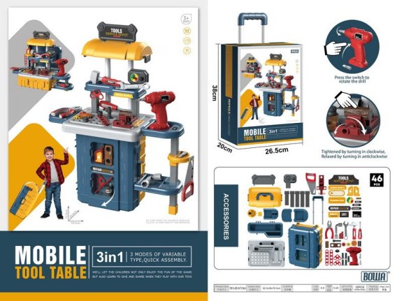 Bogato wyposażony zestaw małego majsterkowicza dla dzieci od 3-go roku życia. Zestaw wykonany został z wysokiej jakości plastiku i składa się z 46 elementów. Części konstrukcyjne zestawu możemy układać w 3 różnych układach. W pierwszym układzie powstanie duży warsztat ze stołem na narzędzia. W drugim mały, przenośny warsztat, a w trzecim układzie powstanie duża walizka z rączką do przenoszenia, w której możemy zmieścić wszystkie narzędzia. W zestawie prócz części konstrukcyjnych znajduje się również: wkrętaka na baterie z ruchomym wiertłem, imadło, młotek, piłka, klucze, śrubokręt, śrubki czy też kanister. Wkrętarka zasilana jest bateriami typu 2 x AA 1,5 V (brak w zestawie).