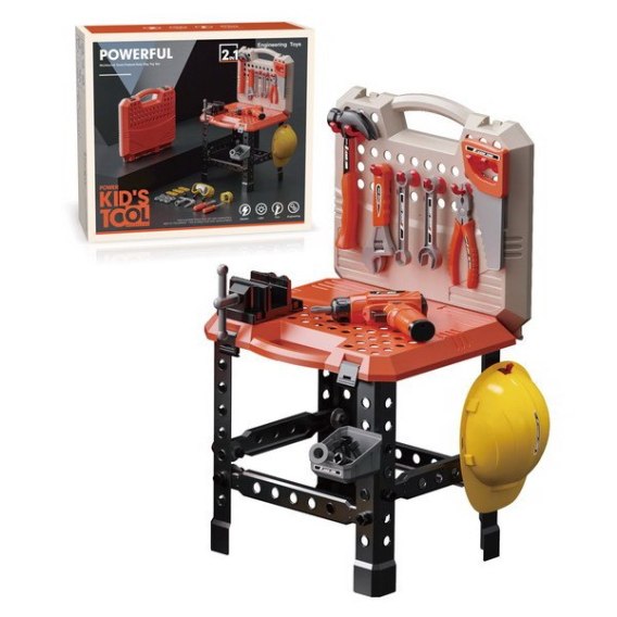 Bogato wyposażony zestaw małego majsterkowicza z możliwością ułożenia warsztatu lub walizki na narzędzia, dla dzieci od 3-go roku życia. Zestaw składa się z 90 elementów, takich jak: elementy konstrukcyjne warsztatu i walizki, klucze, kombinerki, klucz francuski, młotek, wiertarko-wkrętarka interaktywna, imadło, okulary ochronne, śrubki do wkręcania, nasadki, śrubokręty itp. Wszystkie elementy zostały wykonane z najlepszej jakości plastiku. Wiertarko-wkrętarka zasilana jest bateriami typu 2 x AA 1,5 V (brak w zestawie), wkręca i wykręca, a podczas pracy wydaje odgłosy charakterystyczne dla prawdziwego urządzenia i posiada oświetlenie w postaci świecącej czerwonej diody z przodu wkrętarki.