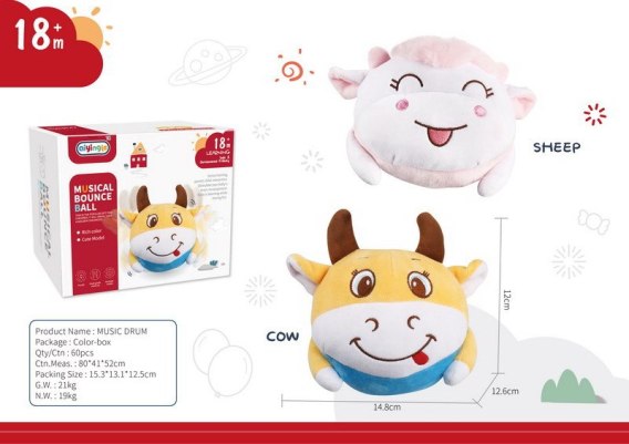 Wesoła skacząca krowa z funkcją dźwięków i świateł, dla maluszków od 18-go miesiąca życia. Krówka na pierwszy rzut oka jest milutką, pluszową przytulanką, ale kryje w sobie tajemnicę. W środku znajduje się okrągły element funkcyjny. Po uruchomieniu go krówka skacze, przemieszcza się i wydaje z siebie wesołe melodie. Kuleczka w środku posiada podświetlenie. W zestawie znajduje się pilot sterujący krówką. Element funkcyjny może być wyjmowany ze środka i ładowany za pomocą kabla USB, znajdującego się w zestawie. Krówka zasilana jest akumulatorem typu 3,7 V (w zestawie), pilot bateriami typu 1 x CR2025 3 V (w zestawie).