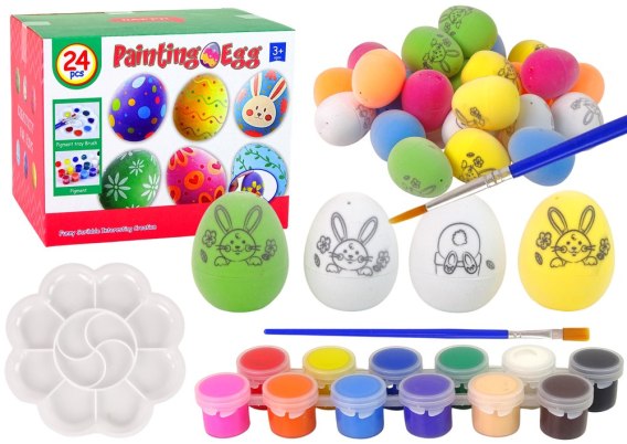 W zestawie znajdują się 24 sztuki jajeczek w 6 kolorach i zestaw farb i brokatów, czekają na stworzenie pięknych jajeczek. Paleta na farby umożliwi mieszanie kolorów, a po skończonej pracy, gdy tylko dzieła wyschną, można zawiesić je za pomocą specjalnych zawieszek jak ozdoba mebli bądź firanek. Dla ułatwienia na pisanka namalowane są wzory wielkanocne, wystarczy je tylko pomalować. Stworzysz piękną ozdobę pokoju, która doda akcent świąteczny w Twoim domu.