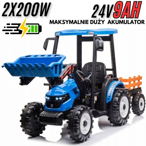 Wielki traktor na akumulator TITAN 24V 2x200W z przyczepką łyżką + kabina niebieski