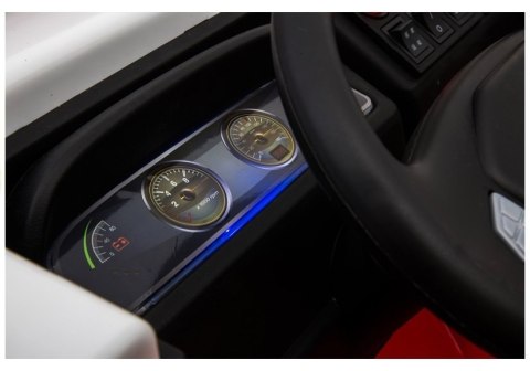 Wewnątrzzdalnie sterowanego wozu strażackiego dla dziecka umieszczono obrotową kierownicę z przyciskiem uruchamiającym dźwięki i klakson, podświetlaną deskę rozdzielczą przedstawiającą imitacje zegarów obrotomierza i prędkościomierza, a także rewelacyjny moduł muzyczny, w którego konstrukcji znajduje sięprawdziwe radio FM z przyciskami nawigacyjnymi oraz portem USB, TF i AUX. Pozostałe z przycisków umieszczonych na kokpicie to przycisk START/STOP, służący do włączenia i wyłączenia pojazdu, przełącznik przednich świateł LED, przełącznik jazdy PRZÓD/STOP/TYŁ i najistotniejszy — przycisk uruchamiający rewelacyjne efekty świetlne i dźwiękowe. Migoczące na czerwono koguty oraz syrena dźwiękowa z pewnością sprawią, że każdy kilkulatek poczuje się jak w prawdziwym samochodzie. Obsługa dziecięcego pojazdu elektrycznego jest bardzo intuicyjna i prosta.
