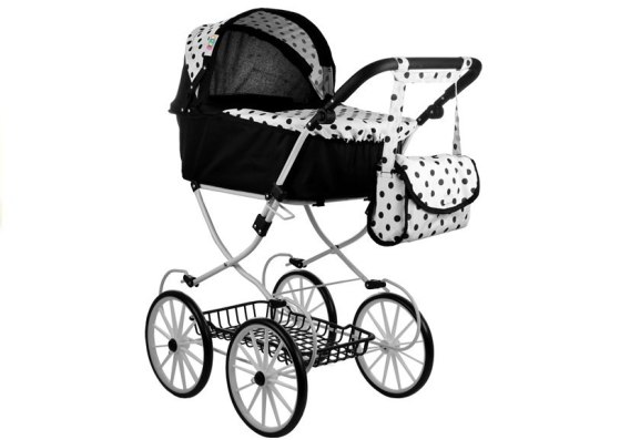 Czarno-biały retro wózek posiada ozdobny detal, jakim są groszkami w kontrastującym kolorze, umieszczone między innymi na daszku, pokrywie gondoli czy torbie — co dodaje mu dużego uroku. Retro wózeczek z pewnością zainteresuje i zachęci do zabawy każdą małą opiekunkę — gwarantują to wymiary dopasowane do przeciętnego wzrostu kilkuletnich dziewczynek, a także wzornictwo inspirowane budową prawdziwych wózków dla dzieci. Co istotne — prezentowany retro model może rosnąć razem z dzieckiem, ponieważ posiada rączkę z możliwością regulowania jej wysokości. Wózek będzie odpowiedni dla wszystkich lalek i zabawek o maksymalnej długości 69 cm — duże wymiary gondoli z łatwością pomieszczą kilku zabawkowych pasażerów.
