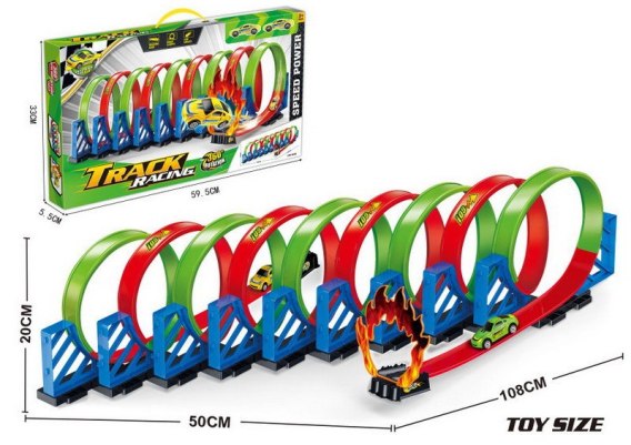 Tor wyścigowy z wyrzutnią i 9 pętlami 360 stopni, dla dzieci od 3-go roku życia. Tor wykonano z najlepszej jakości plastiku w żywych kolorach. Tor posiada odcinek prosty do rozpędzenia pojazdu, 9 pętli 360 stopni, wyrzutnię i dwa pojazdy. Pojazdy napędzane są napędem pull back. Wystarczy delikatnie nacisnąć pojazd do tyłu, by przejechał tor z pełną mocą.