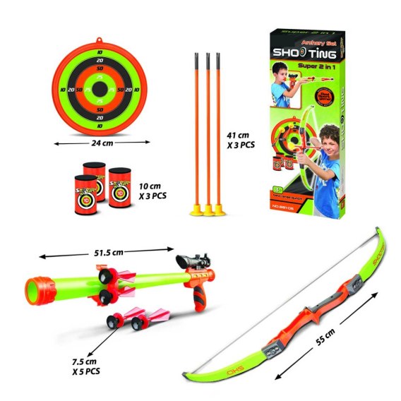 Zestaw 2w1 łuk i pistolet dla dzieci od 3-go roku życia. Zestaw wykonany został z najlepszej jakości materiałów w żywych kolorach. W zestawie znajduje się łuk, pistolet z celownikiem laserowym, strzały do łuku, strzałki do pistoletu, tarcza oraz beczułki (cele). Strzały i strzałki zakończone są gumowymi przyssawkami. Zestaw idealny do aktywnego spędzenia czasu na świeżym powietrzu.