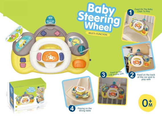 Interaktywna kierownica dla dzieci od pierwszych dni życia. Zabawka wykonana została z najlepszej jakości plastiku w żywych kolorach przyciągających wzrok dziecka. Jest bezpieczna dla maluszków, nie posiada żadnych ostrych krawędzi. Zabawka posiada paski zapinane na rzepy, które można przymocować do wózka, łóżeczka, siedzenia samochodu czy krzesełka do karmienia. Zabawka zasilana jest bateriami typu 3 x AA 1,5 V (brak w zestawie).