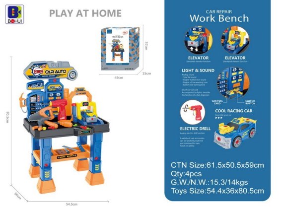 Wielofunkcyjny, interaktywny warsztat z funkcję dźwięku i światła to propozycja dla dzieci od 3-go roku życia. Zestaw został bogato wyposażony, może pełnić funkcję warsztatu samochodowego, myjni czy też stacji paliw. Na blacie warsztatu znajduje się podnośnik, aby mały mechanik mógł zajrzeć na podwozie auta i dokonać napraw. Tablica nad blatem posiada panel, na którym znajduje się przycisk, po naciśnięciu, na który mamy losową awarię, jaką należy naprawić w samochodzie. Kiedy naprawimy awarię, należy jeszcze raz nacisnąć przycisk, wówczas usłyszymy odgłosy naprawionej awarii i fanfary.