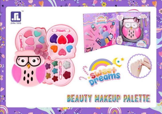Bogato wyposażony zestaw do makijażu dla dzieci od 5-go roku życia. Kosmetyki są łatwo zmywalne i bezpieczne dla skóry dziecka. Zestaw zawiera mnóstwo dodatków, które z pewnością ucieszą, każdą młodą damę. Kosmetyki umieszczone zostały w rozkładanej szkatułce z wizerunkiem sowy. Zabawa tym zestawem pobudza kreatywność, rozwija zmysły i ukształtuje poczucie estetyki i piękna.