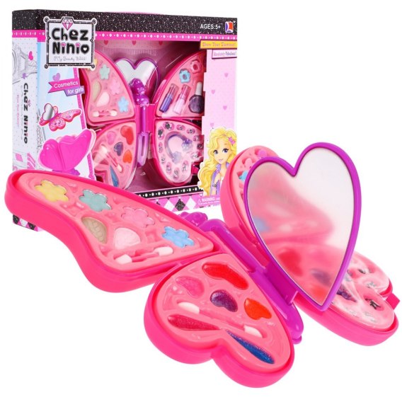 Niesamowity, bogato wyposażony zestaw kosmetyków w poręcznym zamykanym pudełku w kształcie motyla. W zestawie znajduje się wiele kosmetyków takich jak: cienie do powiek, pędzelki, błyszczyki, szminki, lakier do paznokci, spinki do włosów oraz tipsy i gumeczki do włosów. Pudełeczko z kosmetykami, po skończonej zabawie można zamknąć, nie zajmuje dużo miejsca.